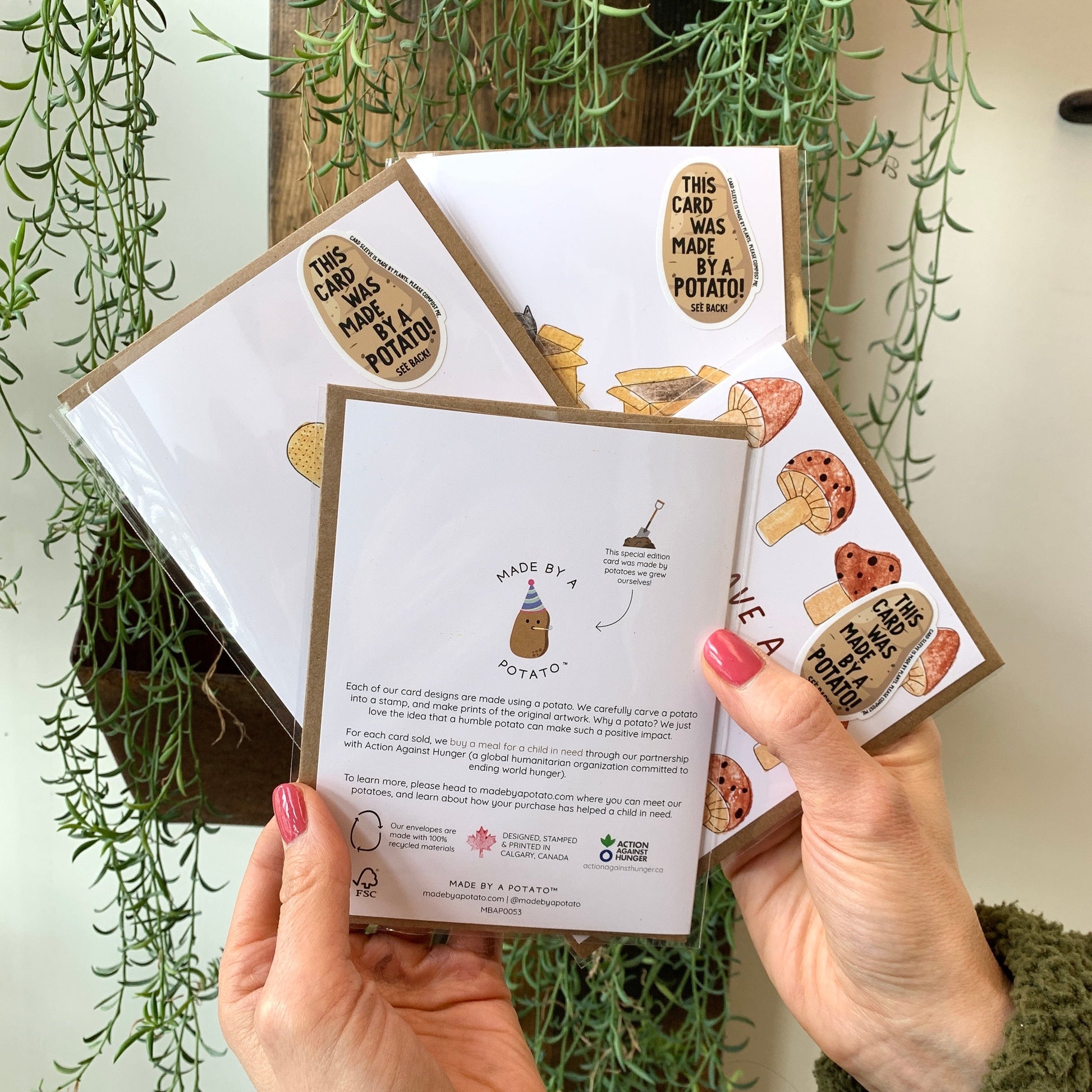Once we're done stamping, we salvage as much left-over potato as we can to compost safely! Our cards are made using FSC (Forest Stewardship Council) Certified and Rainforest alliance friendly paper and feature a 100% recycled envelope. Instead of a plastic sleeve, we use an eco friendly card clasp.