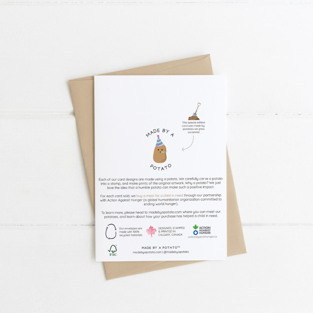 Made by a Potato greeting cards are all originally created using a carefully carved potato stamp. This card is a print of the original artwork.