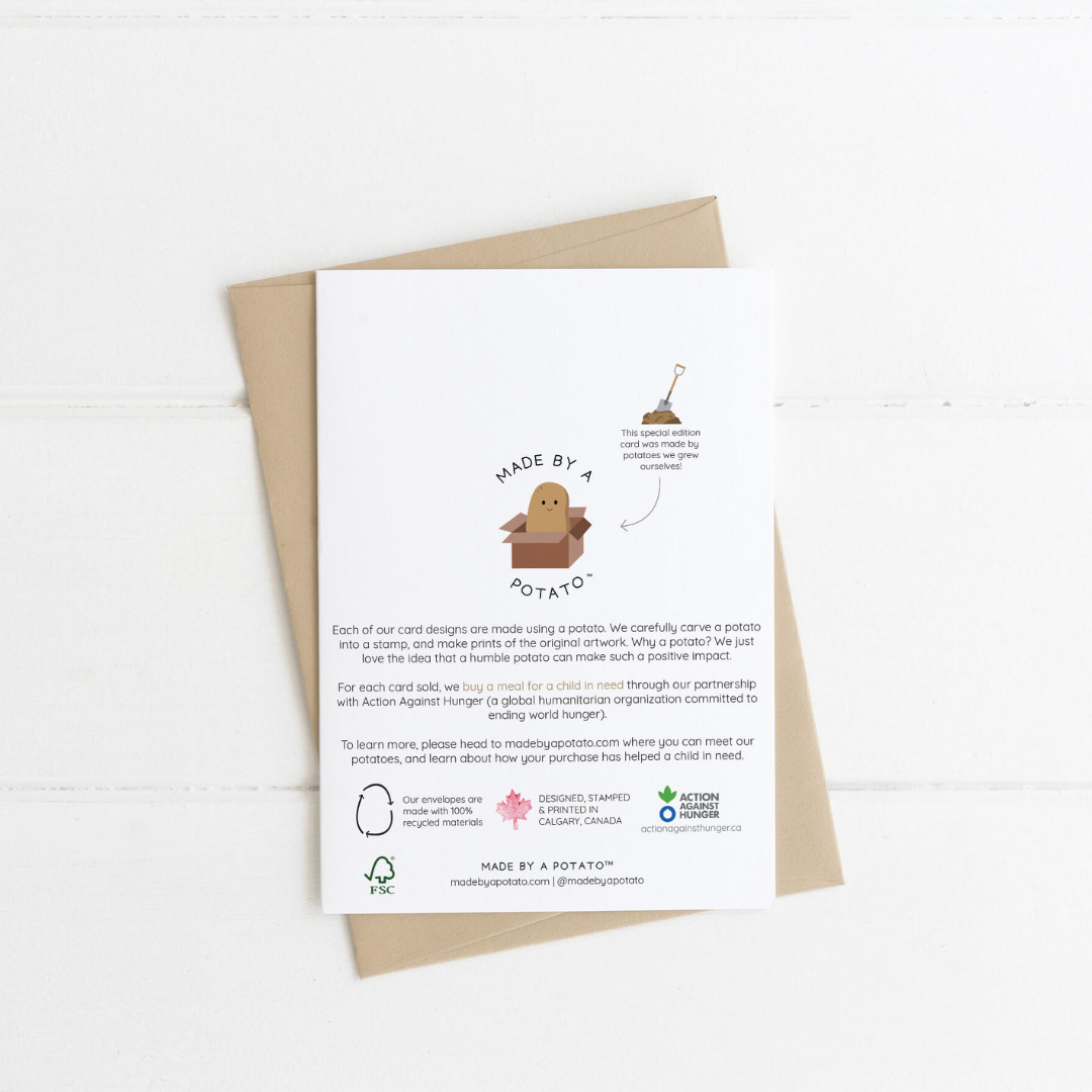 Once we're done stamping, we salvage as much left-over potato as we can to compost safely! Our cards are made using FSC (Forest Stewardship Council) Certified and Rainforest alliance friendly paper and feature a 100% recycled envelope. Instead of a plastic sleeve, we use an eco friendly card clasp.
