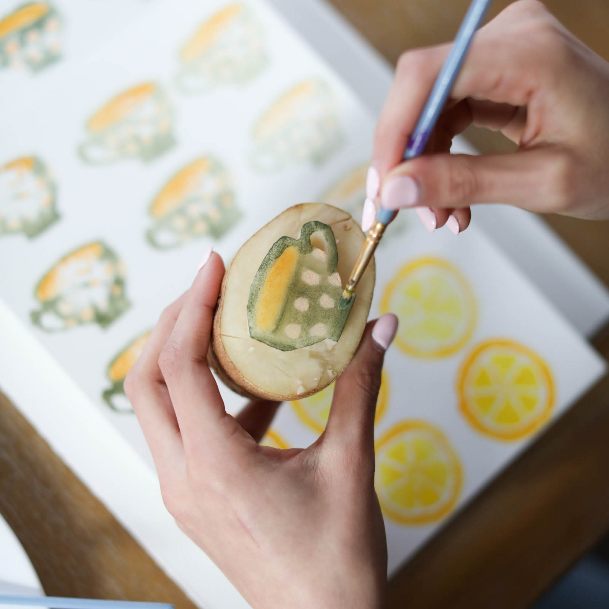 Once we're done stamping, we salvage as much left-over potato as we can to compost safely! Our cards are made using FSC (Forest Stewardship Council) Certified and Rainforest alliance friendly paper and feature a 100% recycled envelope. Instead of a plastic sleeve, we use an eco friendly card clasp.